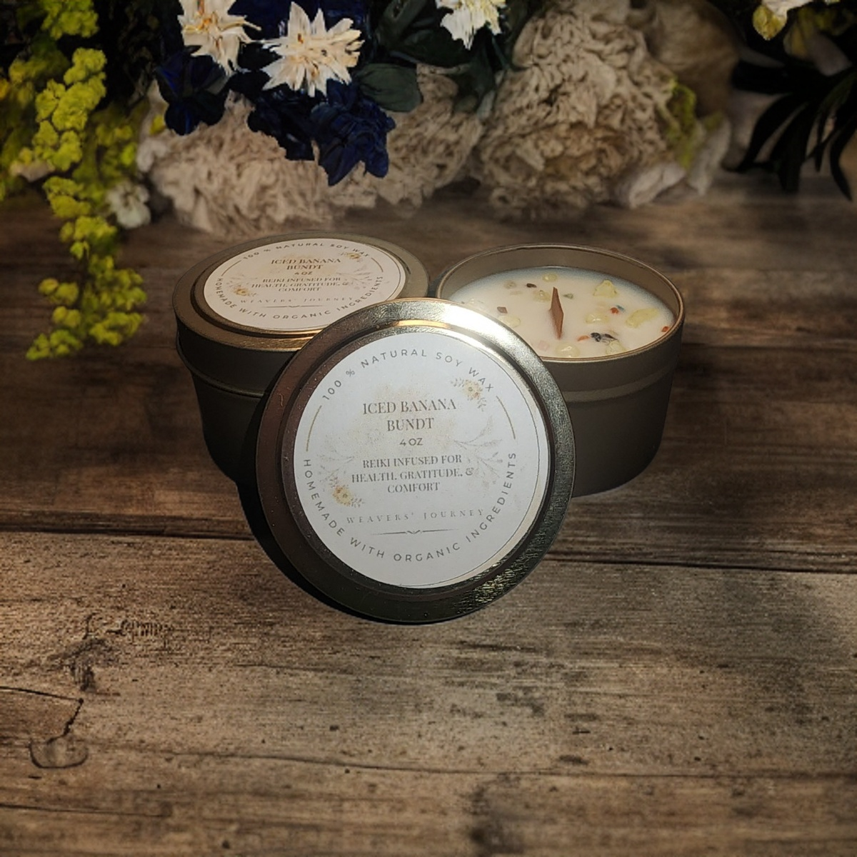 Our delectable Iced Banana Bundt candle captures the aroma of a mouth-watering spice bundt cake rich with fresh banana and toasted walnuts. Let this fill your home with the inviting scent of freshly-baked banana cake and warm spices. Enjoy the comforting and inviting aroma of this delicious bundt cake! Infused with natural Crystal chips on top.